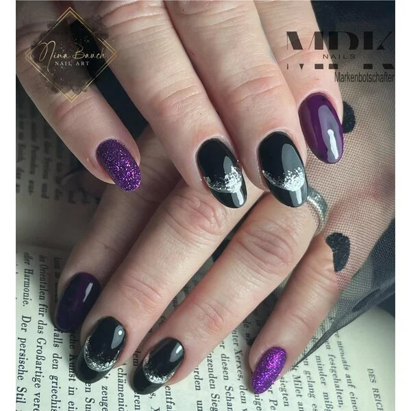 Ein echter Klassiker ist die Kombination von Schwarz mit funkelnden Akzenten. Ob silberner Holo-Glitter, goldenes Funkeln oder bunte Highlights – Glitzer verleiht dem dunklen Grundton sofort Glamour. Besonders beliebt: ein schwarzes Fullcover, das an einem oder zwei Nägeln mit Glitzer überzogen wird.