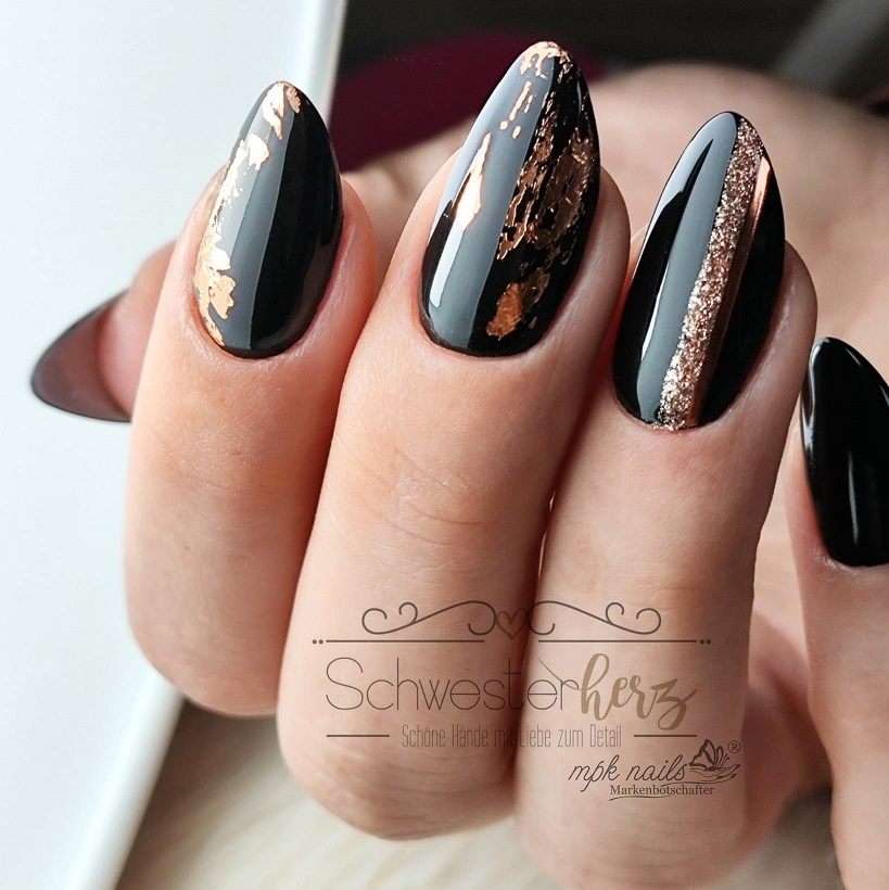 Abendveranstaltung: Schwarz mit goldenem Glitter oder Chrome-Powder für Glamour.