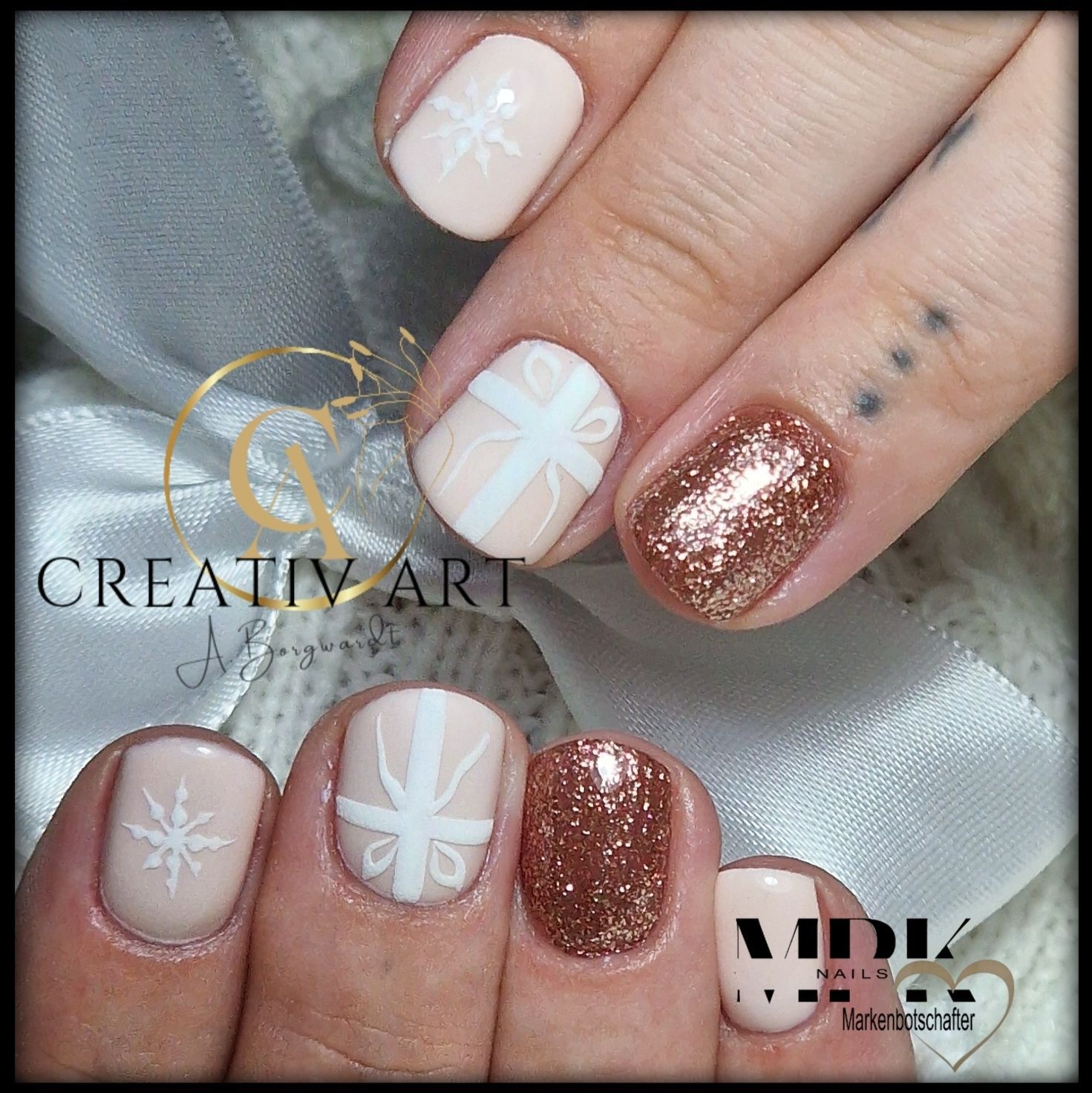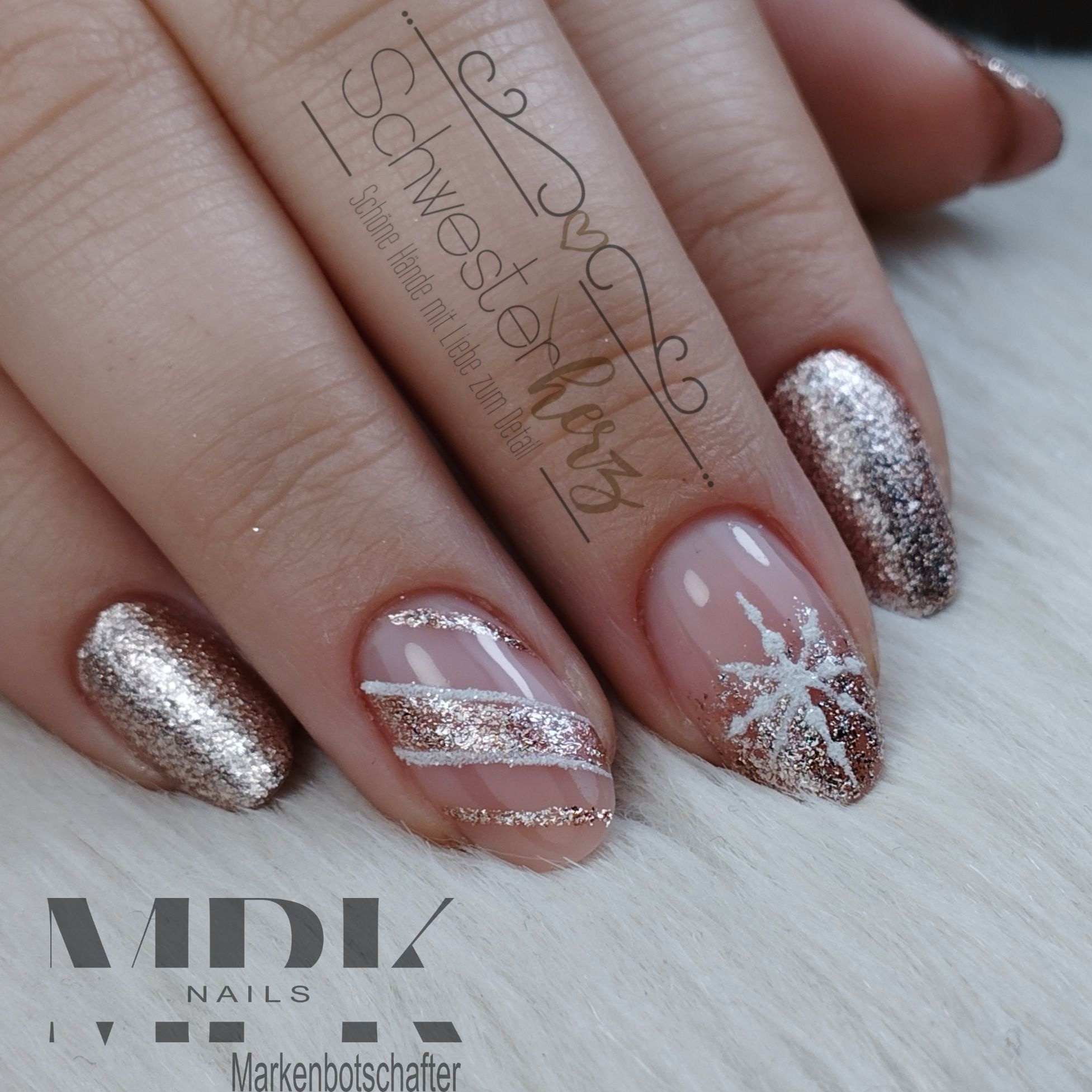 Design: Mit feinem Liner Pinsel Schneeflocken oder Linien aufmalen, anschließend Glitzer Gel in Silber oder Rosé punktuell auftupfen.